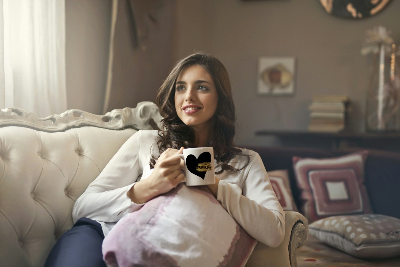 Skodelica z napisom: Srečna. Vzemi si trenutek zase in pomisli na vse dobro, kar ti je življenje podarilo in tudi naučilo. Pomisli na krog ljudi ob katerih se počutiš ljubljeno, na vse za kar si hvaležna ter svoje dosežke na katere si ponosna. Čutiš srečo?