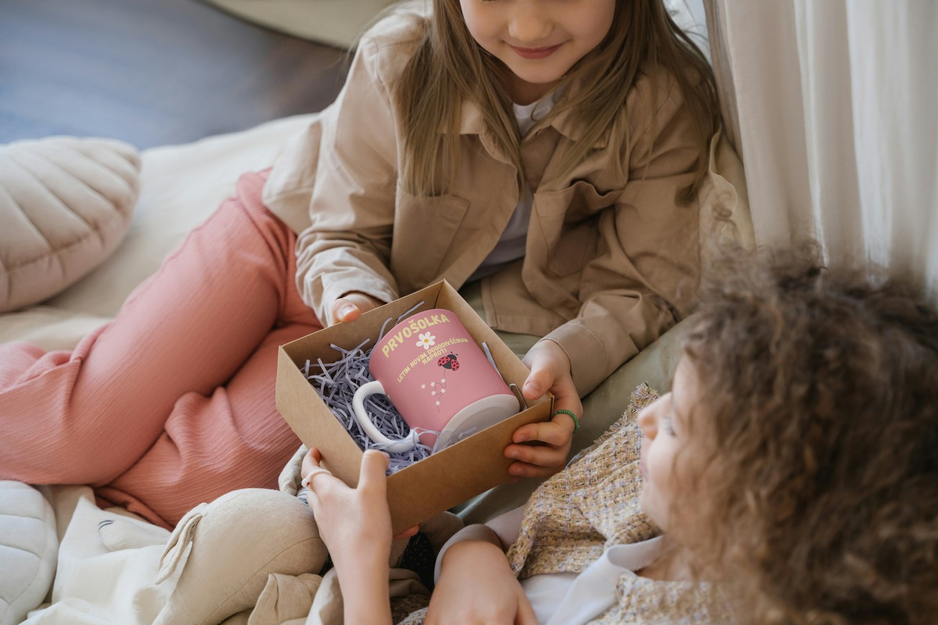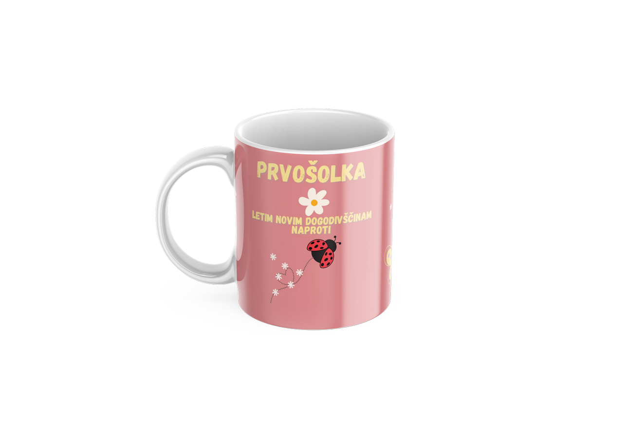 Podari prvošolki skodelico z motivi letečih živali in besedilom “letim novim dogodivščinam naproti” in ji predaj sporočilo da je dovolj samostojna in pripravljena na nove izzive ter da vedno lahko računa na pomoč staršev.
